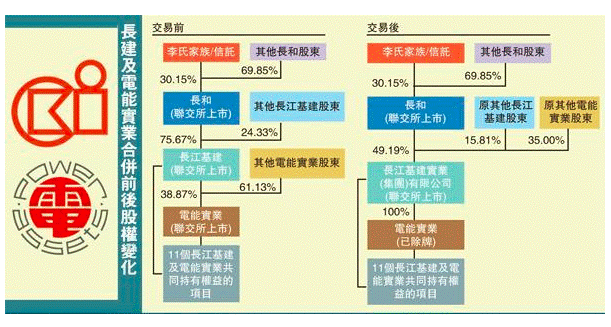(下圖為長(zhǎng)建及電能合并前后的股權(quán)變化,圖片來(lái)自香港《文匯報(bào)》)